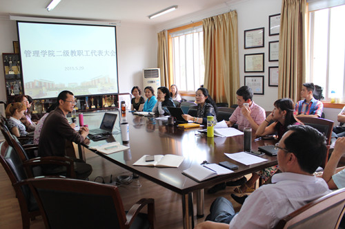 【本网讯】5月29日上午,管理学院在龙泉校区第二行政楼三会议室召开了二级教职工代表大会。管理学院全体二级教职工代表参加了会议。会议由二级教代会主席郭创乐主持。