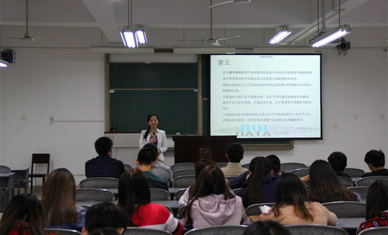 【本网讯】为了深化大数据时代同学们对于大数据影响决策的认知,帮助他们建立利用大数据驱动决策的能力和意识,4月19日晚,管理论坛系列讲座之“大数据与决策”在龙泉校区 2106教室顺利举行。讲座由管理学院孙艳玲教授主讲,14级信息系统与管理专业的同学参加了本次讲座。