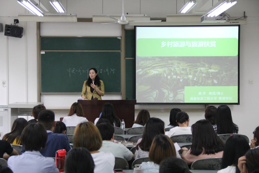 2017年6月13日,管理学院“乡村旅游乡村扶贫”专题讲座在成都信息工程大学龙泉校区2202教室成功举行。本次讲座由管理学院院长黄萍主讲,旅游管理专业的同学聆听了本次讲座。