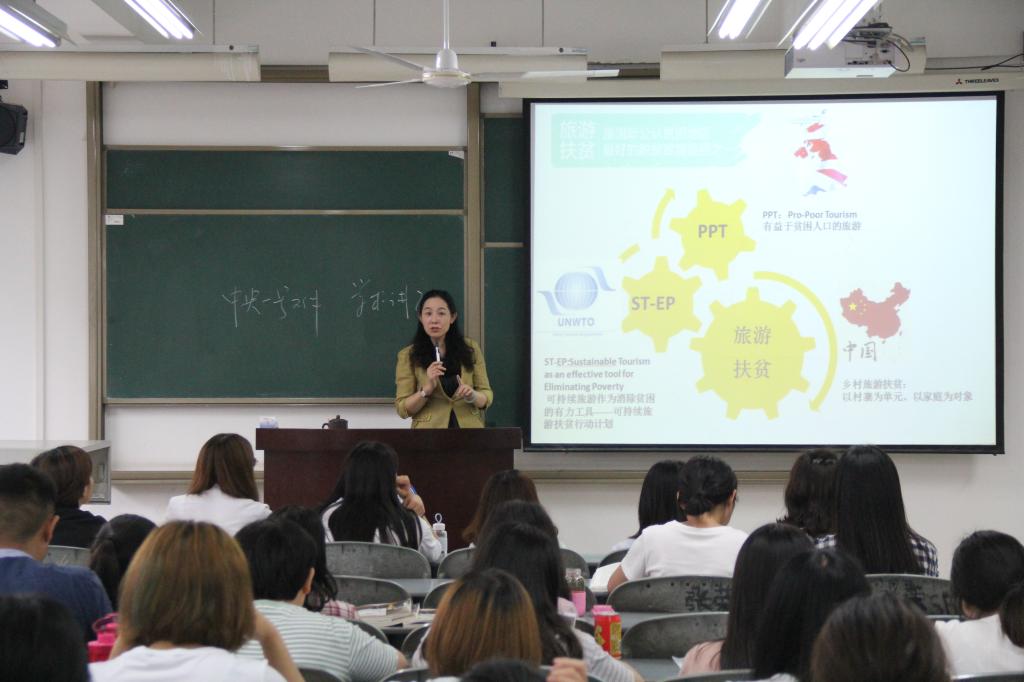 黄萍教授从“乡村旅游是旅游扶贫的重要力量”出发,首先点明了旅游扶贫对于贫困农村脱贫的重要性。随后,她针对“乡村旅游扶贫的条件与困境”与案例相结合,向大家讲述了目前我国农村贫困地区的现状与旅游扶贫存在的苦困难。最后,黄萍教授围绕“乡村旅游扶贫如何发力”的话题,将自己田野调查结果与工作经验联系起来,生动形象地为大家讲解了如何更好地进行旅游扶贫。