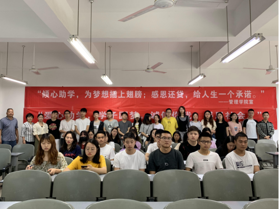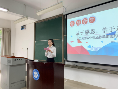 根据四川省教育厅和学生处相关文件精神,为进一步做好我院国家助学贷款工作,增强毕业生的诚信还款意识和社会责任感,6月17日上午,管理学院党委在龙泉校区L2102多媒体教室组织开展了“诚于感恩,信于还贷”2019届毕业生还款承诺签约仪式。参加此次还款承诺签约仪式的有,院党委副书记李璘来,院学生科科长刘宇老师、院学生科副科长徐同老师,毕业班辅导员陈祖伟老师、尚文生老师,以及分管学院助学工作的李雅婧老师,及在校期间办理过国家助学贷款的128名毕业生。