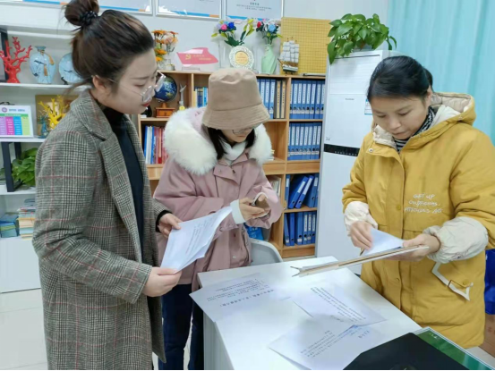 图2管理学院牛雪梅(左1)、党建办主任唐梓晴(左2)与圣南社区居民委员会负责人苏静(右1)熟悉社区行动工作安排