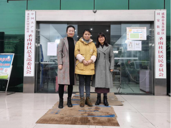 图3管理学院翟艳荣(右1)、牛雪梅(左1)与圣南社区负责人苏静(左2)合照