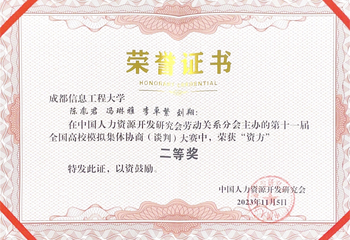 近日,第十一届“全国高校模拟集体协商(谈判)大赛总决赛在河南财经政法大学落下帷幕。我校管理学院人力资源管理学专业陈胤君、冯琳雅、李卓繁、刘翔、陈嘉豪、张婷、章佳祥、樊尚霖八位同学代表学校前往河南财经政法大学参加全国总决赛,经过近两天的比赛,我校资方队荣获二等奖,劳方队荣获三等奖。同时,陈静教授和任竞斐老师获得优秀指导老师奖,劳方代表队陈嘉豪,资方代表队陈胤君获得最佳谈判员。