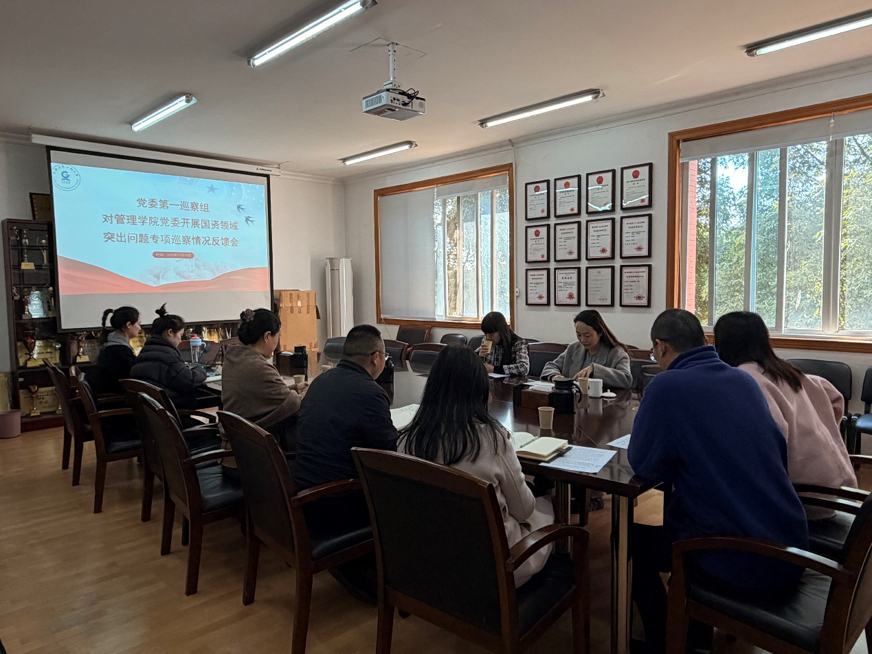11月19日,学校党委第一巡察组专项巡察管理学院党委国资领域突出问题情况反馈会在龙泉校区集贤楼316会议室召开。党委第一巡察组组长唐艳及巡察组组员,管理学院党政班子成员、科级干部参加了反馈会。会议由管理学院党委书记刘敦虎主持。