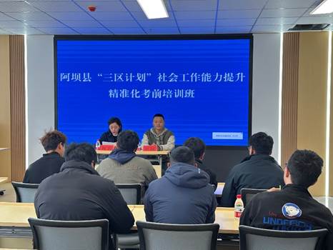 我校“三区计划”的协同单位成都市同行社会工作服务中心的田园高级社工师,为阿坝县社会工作者进行考前培训会。课堂上,田园老师围绕社会工作职业水平考试的科目设置、题型特点、答题技巧等核心内容,为考生系统梳理备考思路,同时结合历年真题案例,现场组织答题实操,切实增强了培训的针对性、实用性和可操作性。