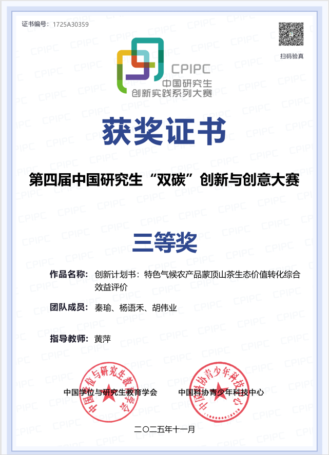 2025年11月7日-9日,由教育部学位管理与研究生教育司指导,中国学位与研究生教育学会、中国科协青少年科技中心主办的第四届中国研究生“双碳”创新与创意大赛于沈阳化工大学落幕。我校管理学院秦瑜、杨语、胡伟业三位研究生组成的“寻香山茶”队在黄萍老师的指导下,以参赛作品《特色气候农产品蒙顶山茶生态价值转化综合效益评价》荣获全国三等奖。
