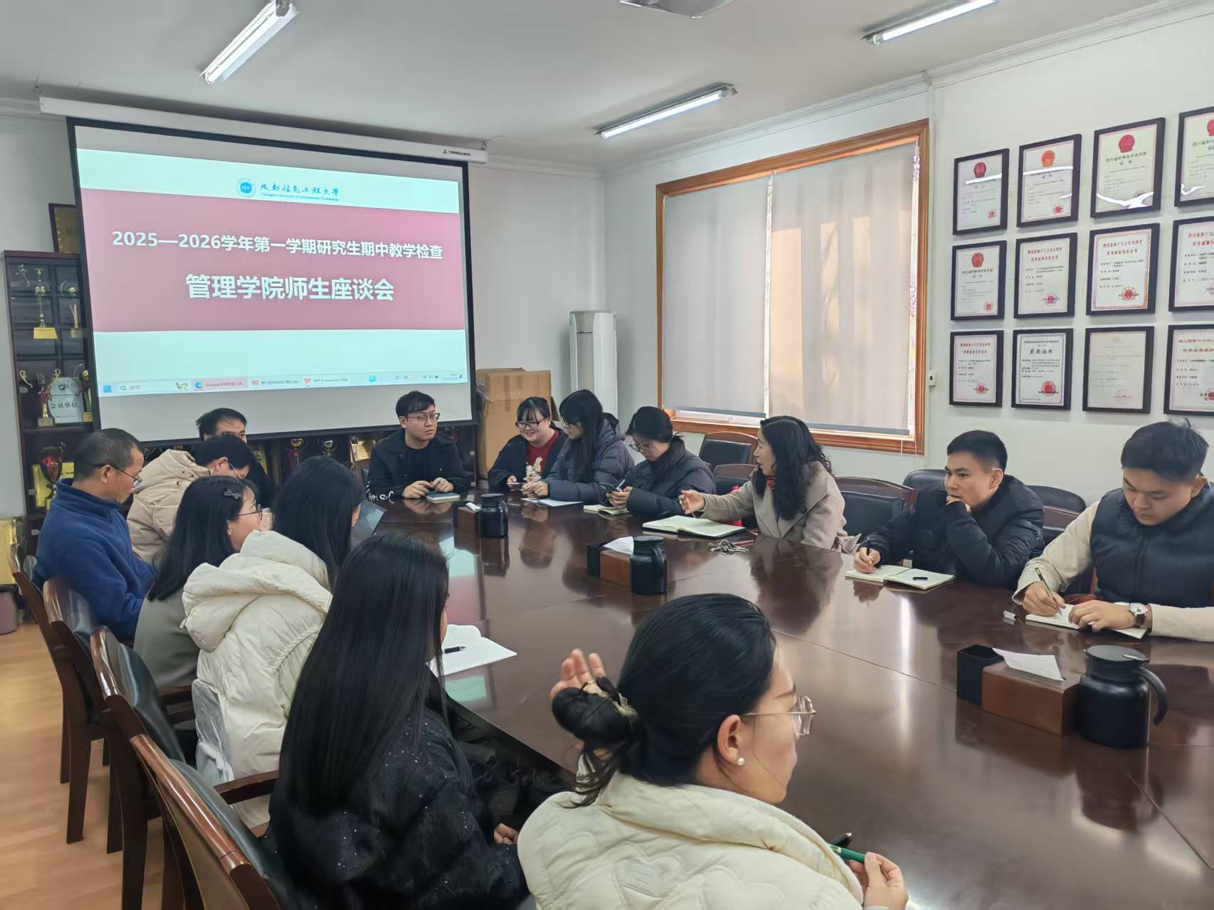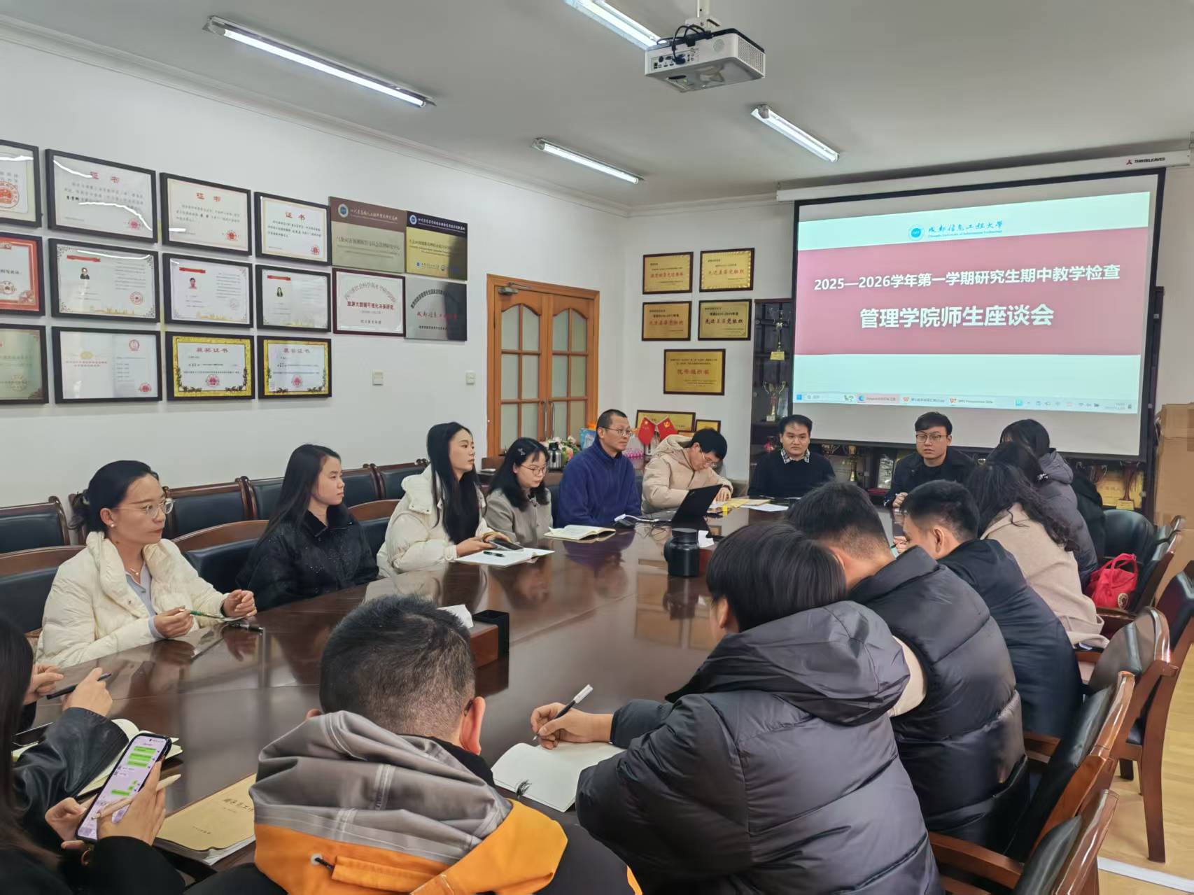 11月26日下午,管理学院在集贤楼316会议室举行了2025年度秋季学期研究生期中教学检查师生座谈会。会议由分管副院长李贵卿教授主持,工商管理学学科中心、管理科学与工程学科中心、农业管理硕士教育中心、工商管理硕士(MBA)教育中心、会计硕士(MPAcc)教育中心、旅游管理硕士(MTA)教育中心主任或副主任、辅导员以及各年级研究生代表参加了会议。