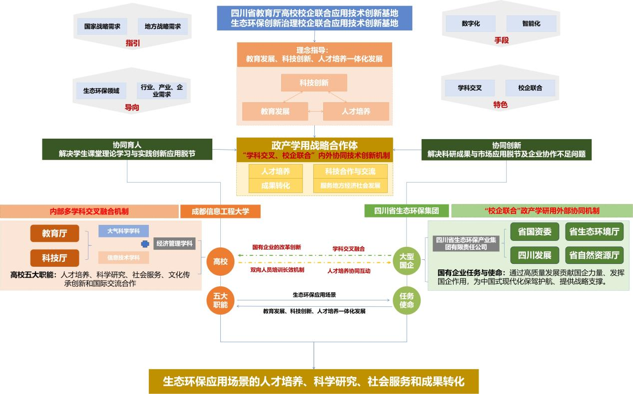 四川省教育厅高校校企联合应用技术创新基地“生态环保创新治理校企联合应用技术创新基地”(以下简称创新基地)于2025年1月获批建设,由成都信息工程大学与四川省生态环保集团联合共建。创新基地以国家、地方战略需求为指引,以生态环保行业、产业、企业需求为目标,依托学校经济管理、大气科学、信息技术三大学科群,整合校内跨学院、多学科研究优势,形成内部多学科交叉融合机制;同时,充分发挥国有大型企业在实践应用的优势,通过校企联合的途径构建政产学研用外部协同机制。将高校五大职能与国有企业任务与使用对接,形成以教育发展、科技创新、人才培养一体化发展理念指导下的“学科交叉、校企联合”内外协同技术创新机制的政产学研用战略合作体。